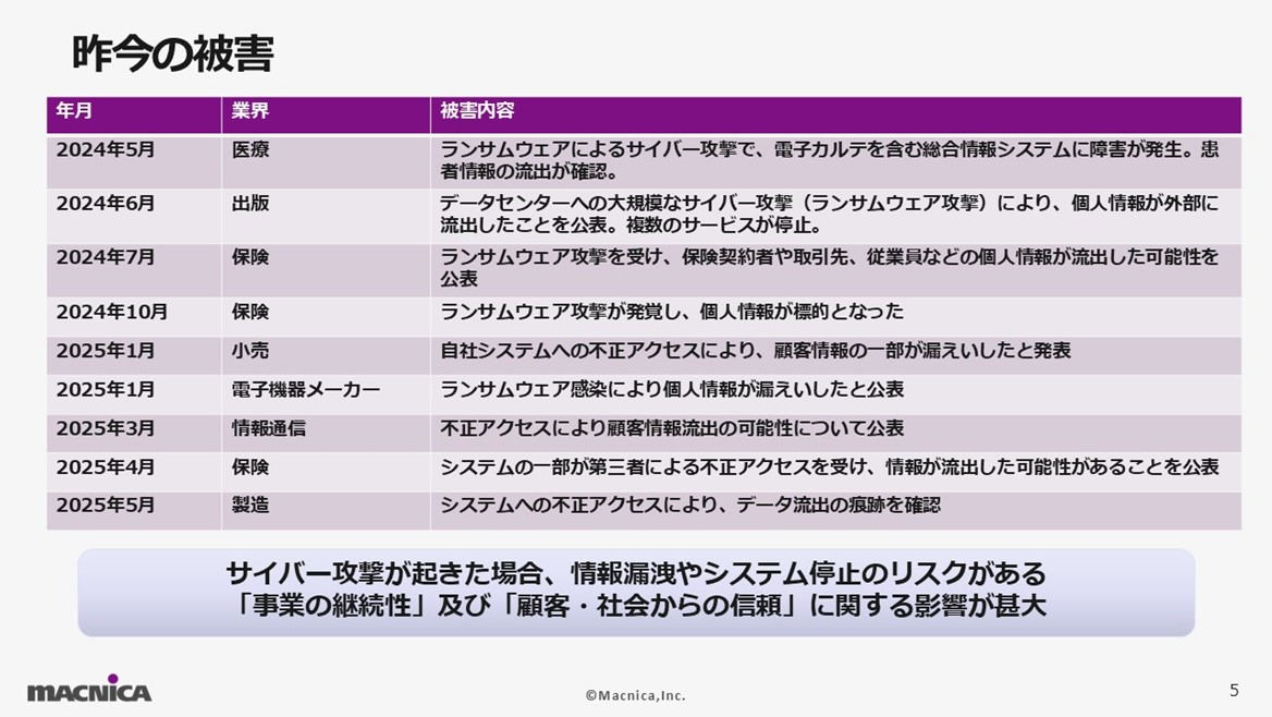 直近1年だけでも複数の業界で、ランサムウェアをはじめとしたサイバー攻撃被害が頻発しています。医療機関の電子カルテシステム障害、出版業界の大規模情報流出、保険・小売業界の不正アクセス事件など、事業継続や信頼性に致命的な影響をもたらす事例が相次いでいます。多くの場合、一定のセキュリティ対策は既に施されているものの、それでも侵入を完全に防ぐのは困難です。