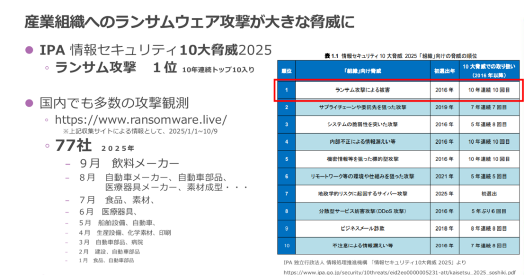 産業やインフラの運転技術(OT)は、今、サイバー攻撃の標的です。直接間接を問わず、操業に影響を与えることで、攻撃目標を効果的に達成できるという認知が攻撃者間で急速に広まりました。特にランサムウェアは、IPAの「情報セキュリティ10大脅威」で1位であり、日本国内でも被害が急増、世界的にも製造業を中心に被害が広がっています。ランサムウェアによる攻撃は、正規アカウントや正規ツールの悪用(LOTL:Living Off The Land)により、検知をすり抜けます。脆弱性があれば悪用され、さらにバックアップ破壊やログ削除により、対応・判断・復旧いずれも難しくします。