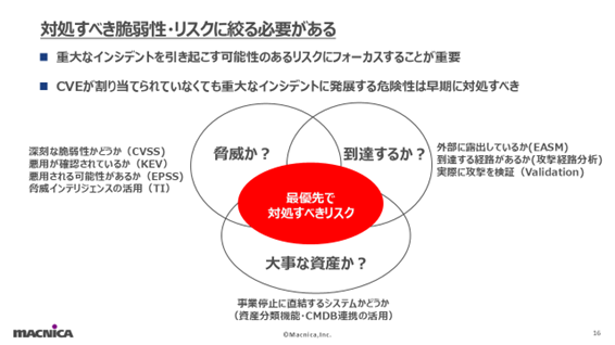 膨大な脆弱性情報の中から真に対処すべきリスクを特定するには、以下の3つの観点が重要です。