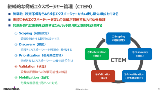 CTEM(Continuous Threat Exposure Management:継続的脅威エクスポージャー管理)は、脆弱性・設定不備などあらゆるエクスポージャーを洗い出し、優先順位を付けて対処するフレームワークです。以下の5つのプロセスで構成されます。